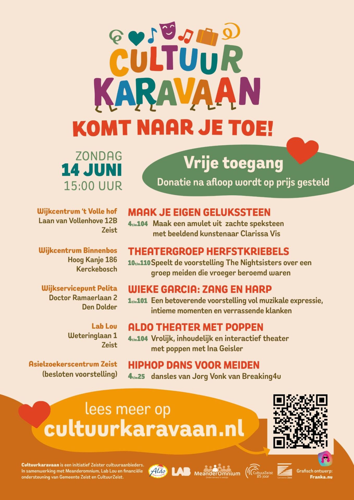 Cultuurkaravaan is een initiatief van Aldo theater en werkt samen met Zeister cultuuraanbieders, CultuurZeist, Gemeente Zeist, Meanderomnium en Lab Lou..
